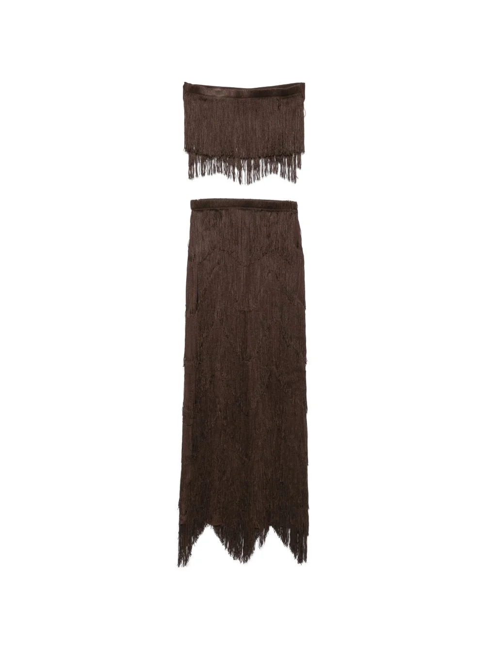 fringed tank top and skirt set Highlights - Brown - Fringed design - High waist Imported Composition Polyester 50%, Cotton 50% Washing instructions Hand Wash