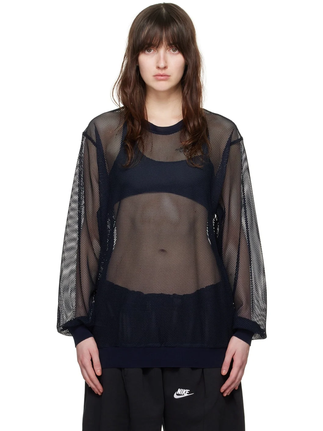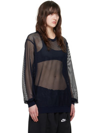 Sheer polyester mesh sweatshirt. · Rib knit crewneck, hem, and cuffs · Dropped shoulders Supplier color: Navy hexagon 100% polyester. Made in Germany 241852F098000