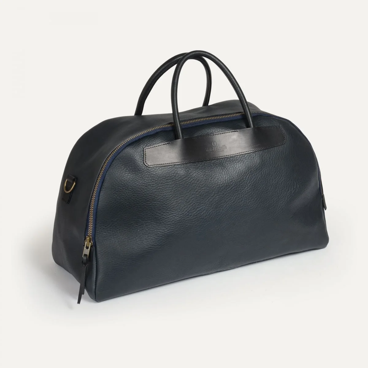 BOWLING TRAVEL BAG A vintage icon transposed to travel, the Bowling bag is a retro nugget in the collection. Its rounded silhouette, luxurious leather and impeccable fit recall the sport-chic bags of the 50s and 60s. Behind this allure is a piece designed to last. Designed for both short and long trips, it offers a compact cabin format with a vast 30 L volume, accessible via a large zipped opening, and ergonomic handles reinforced with braided cord. Made to the highest standards in our workshop in Aveyron, it embodies the alliance of design and craftsmanship. Size: W 47 cm x H 29 cm x D 20 cm Volume: 30 liters. Made in France. The bag can be completed by a removable leather black shoulder strap with felt-lined shoulder tab. MATERIALS The Bowling bag is made from full-grain vegetable-tanned leather, using a process based on mimosa, acacia and chestnut. This natural tanning provides exceptional durability, enhanced waterproofing and a soft, supple feel. Over time, the leather develops a remarkable patina, making each bag a unique piece, imprinted with your history. The handles are reinforced with a braided cotton cord, for comfortable carrying from the very first day, and perfect hold over time. Each bag is entirely handmade in our Saint-Georges-de-Luzencon workshop, and signed by the craftsman who made it. A piece of leatherwork designed to last, beautiful for everyday use and ever more endearing as the years go by. - Water-resistant, vegetable-tanned full-grain leather. - Soft, natural finish. - Velvet-like sanded back finish. - Removable inside zipped pocket in cotton canvas, dated and signed by the craftsman who made it. - Zippered closure. YKK zipper SIZE - Cabin dimensions. - External dimensions: W 47 x H 29 x D 20 cm - Volume: 30 liters.