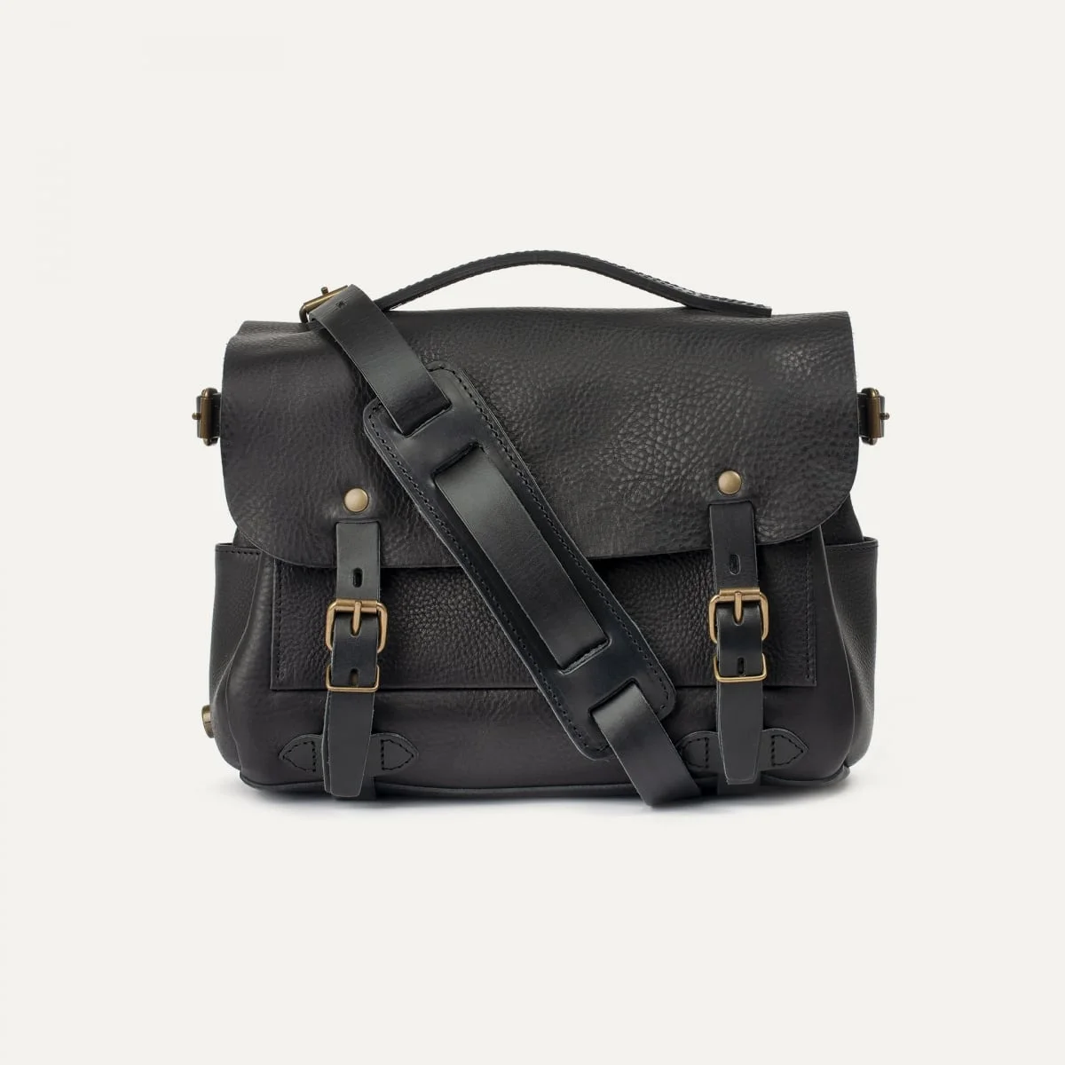 VINTAGE MESSENGER BAG A shoulder bag made from vegetable tanned leather. With its convenient quick opening system, the Eclair bag can be carried either in the hand or over the shoulder, thanks to the removable leather strap. It has three outside pockets including one with a flap closure, and a built-in felt sleeve for an 11-inch laptop. The Bleu de Chauffe label, signed and dated by the artisan who created the bag, is sewn on an inside zippered pocket. Size: L 31 x H 24 x W 10 cm Handmade in France. MATERIALS Today, more than 90% of leather in the world undergoes a chrome tanning process which uses heavy chemical components. Bleu de Chauffe has a different approach. Our leather is vegetable tanned which ensures better quality and more sustainable leather, a soft natural touch, and a patina which improves over the years. - Full grain leather, vegetable tanned and water resistant. - Natural finish, soft to the touch. Handmade patina. - Leather with a ‘velvet’ finish on the reverse. - Removable leather strap and comfortable leather shoulder pad lined with natural felt. - A leather handle makes it comfortable to carry by hand. - Removable inside zippered cotton pocket. - Integrated felt sleeve for laptops. - The Bleu de Chauffe Logo with a brass finish, inspired by 20th century French faucets. The work-wear signature. SIZE - External dimensions: L 31 x H 24 x W 10 cm - Internal dimensions of main compartment: L 25 X H 19 cm (for laptops up to 11 inches) - Internal dimensions of felt pocket : L 26 x H 20 x W 5 cm (for laptops up to 11 inches)