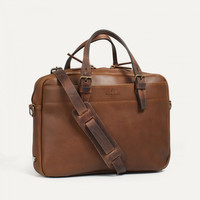 LEATHER COMPUTER BAG FOR MEN The new Folder bag, made from vegetable tanned leather, can be carried in the hand or over the shoulder. It is a very practical business bag with clever features that make travelling easier: a built-in sleeve for a 16-inch laptop Macbook Pro, an inside zippered pocket and two outside pockets. It comes with a removable leather strap which has a comfortable leather shoulder pad lined with natural felt. The zippered pocket at the back has been specially designed to attach the bag to your suitcase’s telescopic handle. The Bleu de Chauffe label, signed and dated by the artisan who created the bag, is sewn onto an inside zippered pocket. Size: L 38 x H 28 x W 6 cm Handmade in France. MATERIALS Today, more than 90% of leather in the world undergoes a chrome tanning process which uses heavy chemical components. Bleu de Chauffe has a different approach. Our leather is vegetable tanned which ensures better quality and more sustainable leather, a soft natural touch, and a patina which improves over the years. - Full grain leather, vegetable tanned and water resistant. - Natural finish, soft to the touch. - ‘Velvet’ finish on the reverse side of the leather. - Removable leather strap and comfortable leather shoulder pad lined with natural felt. - Leather handle making it comfortable to carry by hand. - Removable inside zippered cotton pocket. - Integrated felt sleeve for laptops. - Two outside pockets with magnetic button closures. - The zippered pocket at the back is specifically designed to attach the bag to a suitcase’s telescopic handle. - The Bleu de Chauffe Logo with a brass finish, inspired by 20th century French faucets. The work-wear signature. SIZE External dimensions: L 38 x H 28 x W 6 cm Internal dimensions of main compartment: L 38 x H 26 x P 5,5 cm (for laptops up to 16 inches) Internal dimensions of felt pocket: L 37 X H 26 (Inside compartment for laptops up to a 16’’ MacBook Pro) We recommend measuring your computer to check it will fit Strap dimensions: Adjustable length: 117 cm to 132 cm Drop length*: 42 cm to 50 cm Shoulder strap width: 5 cm *The drop length is the distance between the top of the bag and the top of the strap The shoulder strap has been designed to offer great flexibility of use with its adjustable length, allowing it to be worn over the shoulder or across the body as you prefer. The felt-lined shoulder pads are 5 cm wide and provide balanced weight distribution for maximum comfort, even during prolonged use.