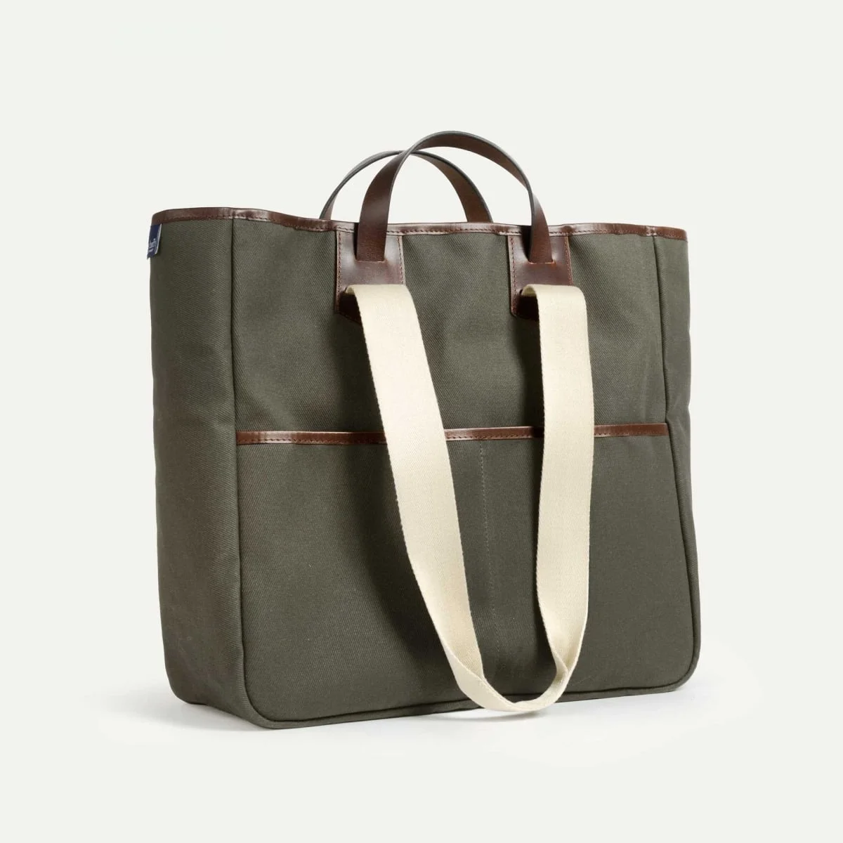 CANVAS AND LEATHER TOTE BAG Meline, the canvas and leather tote with a two-way carrying system Our new Meline tote is a chic new version of the utilitarian bag, functional and stylish. With its generous format and meticulous design, it is great in any situation: daily shopping, a last-minute escapade, or a busy day. Made from British Millerain coated cotton canvas, renowned for its resistance to water and wear, the Meline is as practical as it is attractive. The high-quality twill cotton canvas (590g/m²) provides great protection for your belongings, while retaining a fine texture and soft touch. The vegetable-tanned leather details reinforce the bag and add a touch of class. Its two-way carrying system, in the hand or over the shoulder, makes for effortless use. It also has two front pockets, 19.5 by 19cm, ideal for keeping your essentials close at hand. The perfect unisex bag, it fits seamlessly with an urban, laid-back look. Thanks to the SNAP system, you can easily add a laptop sleeve to transform it into a business bag. Dimensions: L38cm x H35cm x D13cm Made in France. The inside zipped pocket is dated and signed by the artisan who made the bag. MATERIALS For the Meline tote, we have selected an iconic coated cotton canvas designed by British Millerain, world leaders in the art of weaving and coated materials. The Meline tote is made from 18oz lick wax tweed canvas from the British Millerain brand. This 590g/m² canvas is a cut above the rest, with its super-close weave that gives it exceptional resistance to wear and stretch, making it an essential fabric for leatherwork and luggage. The carefully-applied dry wax gives it a non-greasy feel and provides full protection against the weather, ensuring durability and comfort in urban environments. - Details and handles in vegetable-tanned leather - Beige straps. - Zipped closure with YKK zipper - Large rear zipped pocket - Inside removable zipped pocket dated and signed by the artisan who made the bag - Bleu de Chauffe label SIZE - Dimensions: L38cm x H35cm x D13cm- Volume: 15L - Front pocket dimensions: L19.5cm x H 19cm Handles and strap dimensions Handle length: 27cm Strap length: 71cm Strap drop length*: 27cm Handle width: 2cm Strap width: 4cm, 2cm in the middle *the drop length is the distance between the top of the bag and the top of the strap. The handles and straps have been designed to make the bag incredibly versatile: it can be carried in the hand using the handle or over the shoulder with the straps. Their width ensures the weight is spread evenly and gives a good grip, ensuring optimal comfort even when carried for a long time.