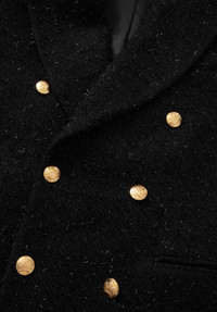 Double-breasted jacket in tonal check boucle with wide peak lapels, six gold crest button closure, two jetted pockets at waist, and welt pocket at chest. MORE DETAILS - Peak lapel and six gold crest button closure - Two jetted pockets at waist and welt pocket at chest. - Double vents at back - Decorative AMF stiches - Roped shoulder - Fully lined - Two internal pockets - Open slits at cuffs