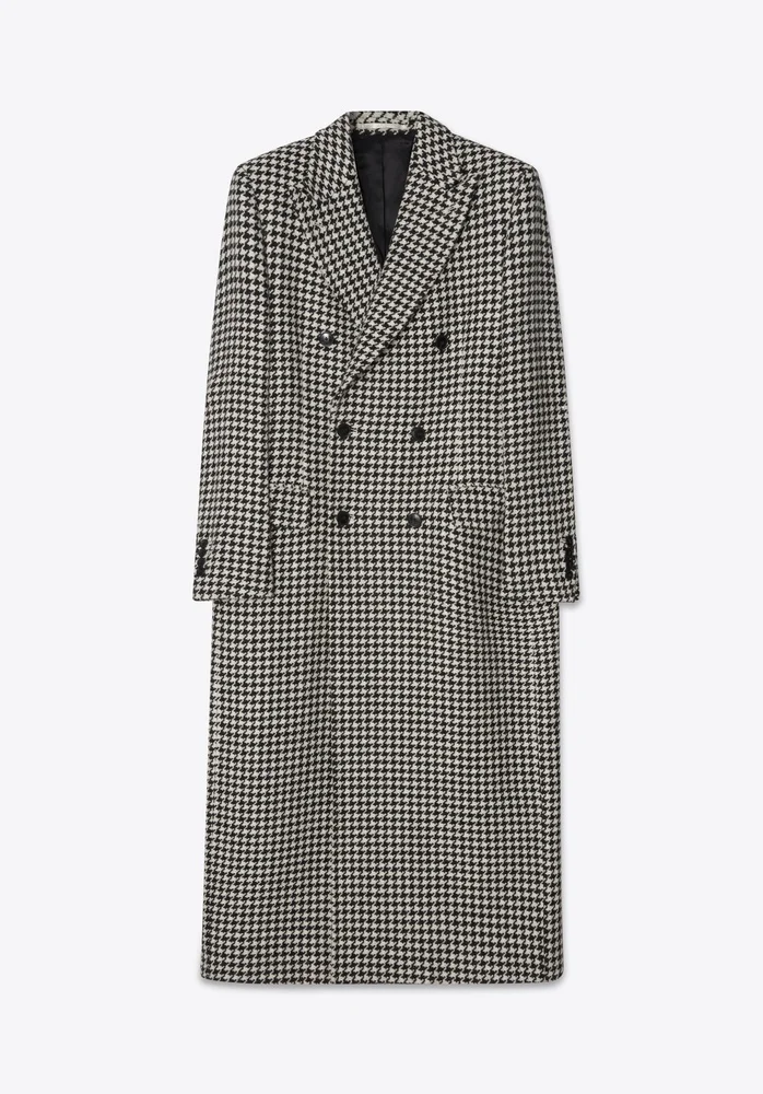 Long double-breasted coat with peak lapel, six button closure and single vent at back. MORE DETAILS - 100% Classic wool - Two jetted pockets at waist with pocket flaps - Four-button cuffs - Decorative AMF stitches at collar and pocket flaps - Roped shoulder - Fully lined
