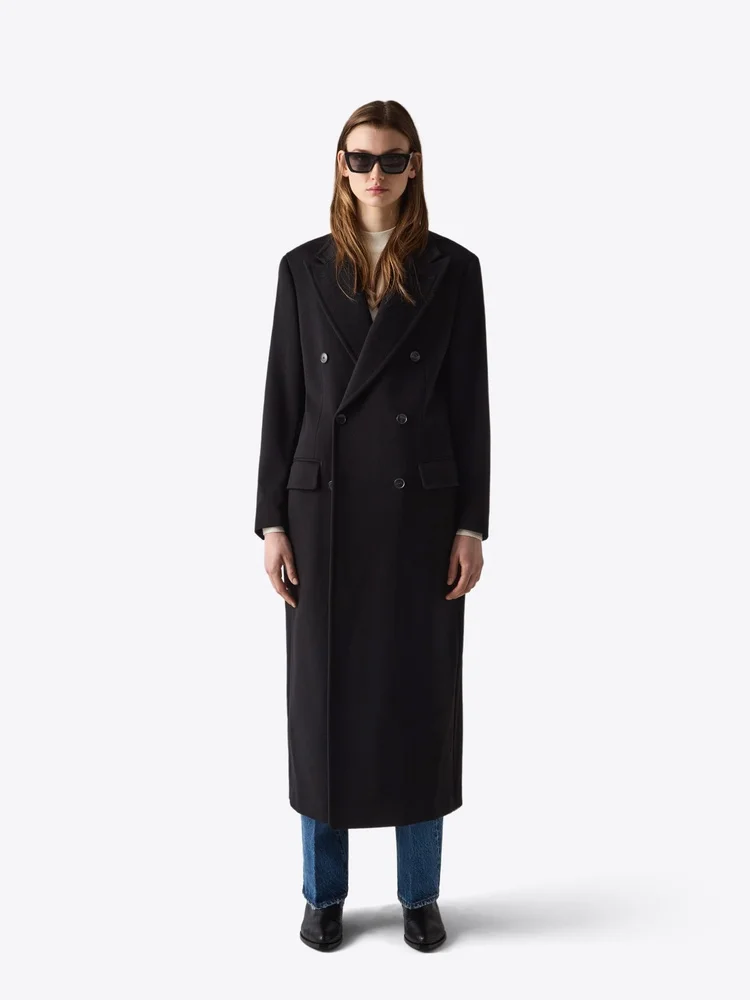 Long double-breasted coat with peak lapel, six button closure and single vent at back. MORE DETAILS - 100% Classic wool - Two jetted pockets at waist with pocket flaps - Four-button cuffs - Decorative AMF stitches at collar and pocket flaps - Roped shoulder - Fully lined
