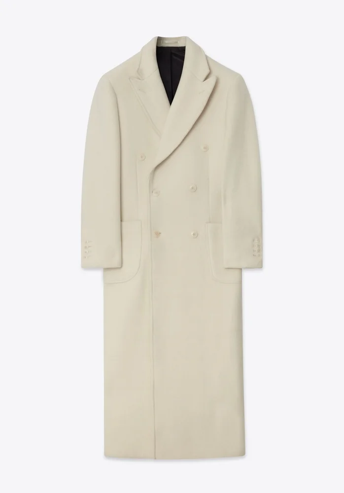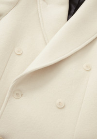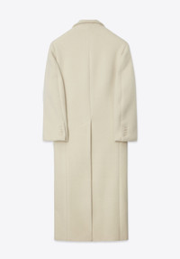 Long double-breasted coat with peak lapel, six button closure and single vent at back. MORE DETAILS - 100% Heavy double wool - Two rounded patch pockets at front - Six button front closure - Four-button cuffs - Off white corozo buttons - Decorative AMF stitches at collar - Padded shoulder - Two internal pockets - Fully lined