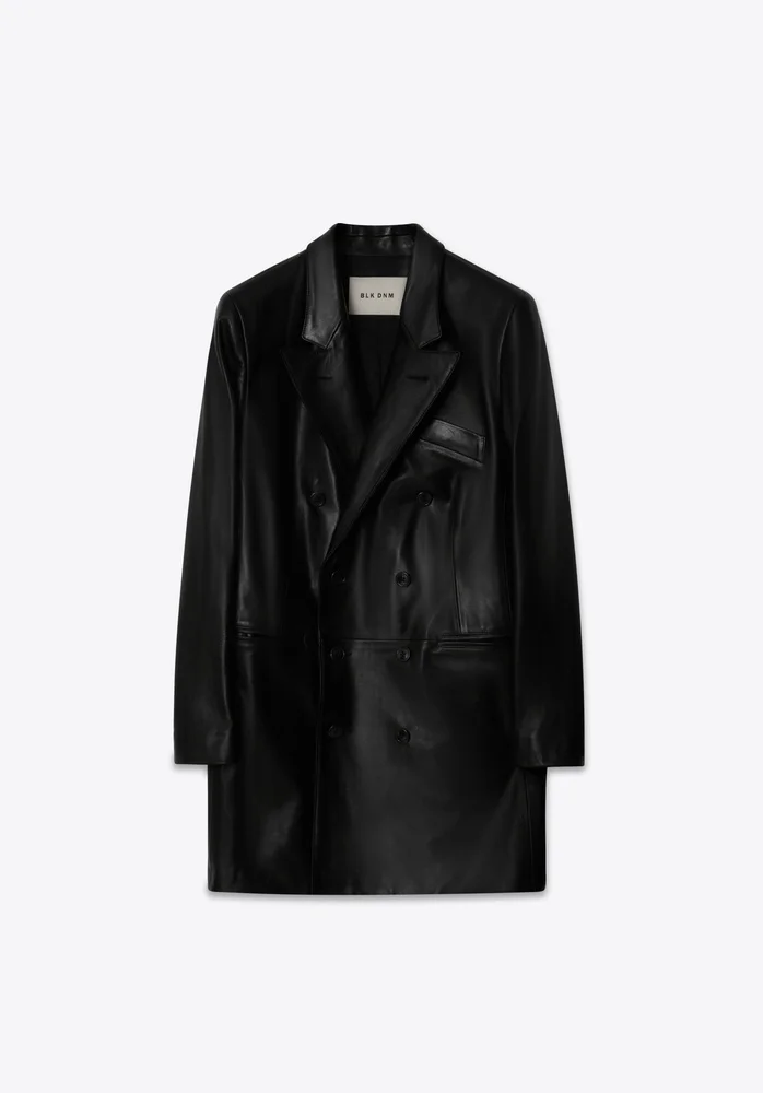 Long double-breasted leather blazer, peak lapel, eight-button closure, two jetted pockets at waist, and welt pocket at chest. MORE DETAILS - 100% Lamb leather - Long straight slim fit - can be worn as dress - Peak lapel and eight button closure - Light shoulder pad - Two jetted pockets at waist - Two internal pockets - Fully lined