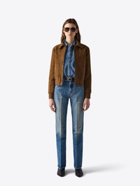 Classic BLK DNM light brown suede blouson jacket. 70s collar, zip closure and ribbed at hem and cuffs. MORE DETAILS - 100% Lamb leather - Cropped Slim Fit - Small gathering at back - Two chest pockets with decorative stiches - Two side pockets - Two interior pockets - Viscose lining - Fully lined