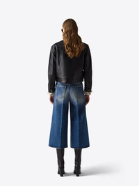 Collarless jacket in soft lamb leather, with denim stich details. MORE DETAILS - 100% lamb leather - Boxy fit - Crew neck - Low cut neck line - Two flap pockets and two velt pockets at side - Five metal button front closure - One metal button sleeve cuff - Fully lined - Viscose lining