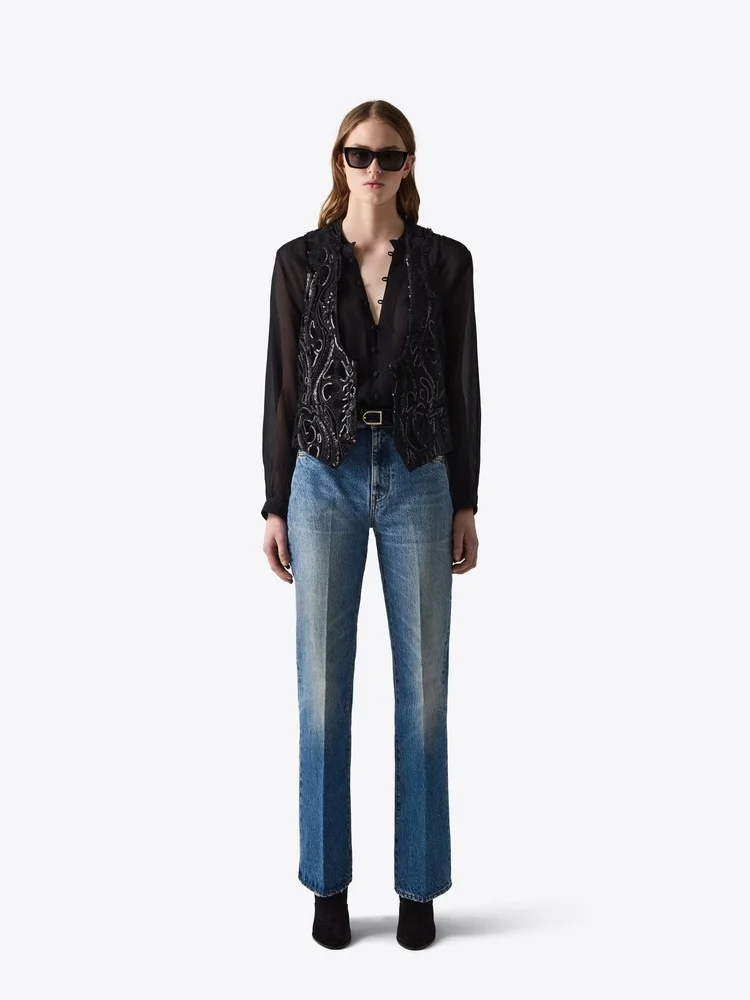 Tailored vest in paisley embroidery, four button closure, two welt pockets at waist, adjustable sliding belt at back. MORE DETAILS - 100% Polyester - Fully lined