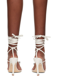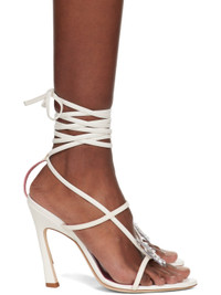 Nappa calfskin heeled sandals in white. · Pointed toe · Crystal-cut PVC graphic applique at vamp · Wraparound self-tie ankle straps · Logo printed at padded leather footbed · Covered stiletto heel with rubber injection · Nubuck sole · Heel: H4.5" Supplier color: Milk Upper: calfskin. Sole: leather, rubber. Made in Italy 241901F125014