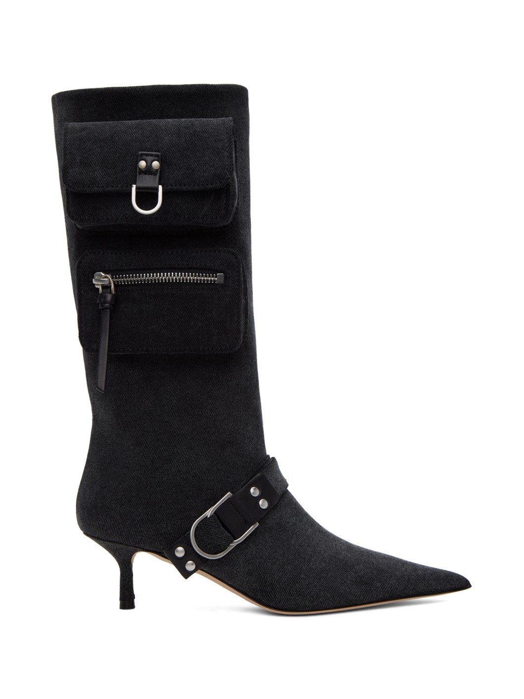 Mid-calf denim boots in blue. · Pointed toe · Cinch strap at vamp · Zip and flap pocket at outer side · Zip pocket at inner side · Grained leather lining · Covered kitten heel with rubber injection · Suede sole · Heel: H2" Supplier color: Dark blue