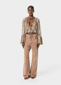 CROPPED SHIRT IN LIQUID LEOPARD PRINT VISCOSE CHIFFON DETAILED WITH RUFFLES AND TIE CLOSURE. COMPOSITION: 100%VI - VISCOSE CHIFFON - LIQUID LEOPARD PRINT - V-NECKLINE TRIMMED WITH A RUFFLE - LONG SLEEVES, COROLLA CUFFS - STRAP CLOSURE - ASYMMETRIC BOTTOM WITH RUFFLES - REGULAR FIT DETAILS COLORS: WHITE, BROWN