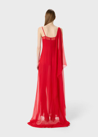 long silk georgette dress with scarf, slit and short train. - Silk georgette - Sleeveless - Spaghetti straps - Scarf - Asymmetrical neckline with draping - Side slit - Back neckline - Back zip closure - Short train - Removable underdress - Floor length - Regular fit - Made in Italy DETAILS To find the correct size for you, please consult the Size Guide. Composition: Main fabric: 100% silk; Slip: 100% polyester Do not wash; Do not bleach; Do not tumble dry; Iron at low temperature - no steam; Dry clean with tetrachloroethylene or hydrocarbons - gentle cycle; Clean inside out; Iron inside out