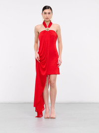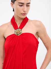 BLUMARINE dress in red, paneled viscose construction, ruching throughout, halterneck, back button fastening, front gold-tone rose hardware, sleeveless, open back, asymmetric draping, asymmetric hem, lined, mini-maxi length, relaxed fit. Made in Italy Outer: 100% Viscose Inner: 75% Nylon 25% Elastane Application: 100% Zamac Italian Sizing Model is 5'7" wearing size 40. Bust: 31" Waist: 24" Hips: 30"