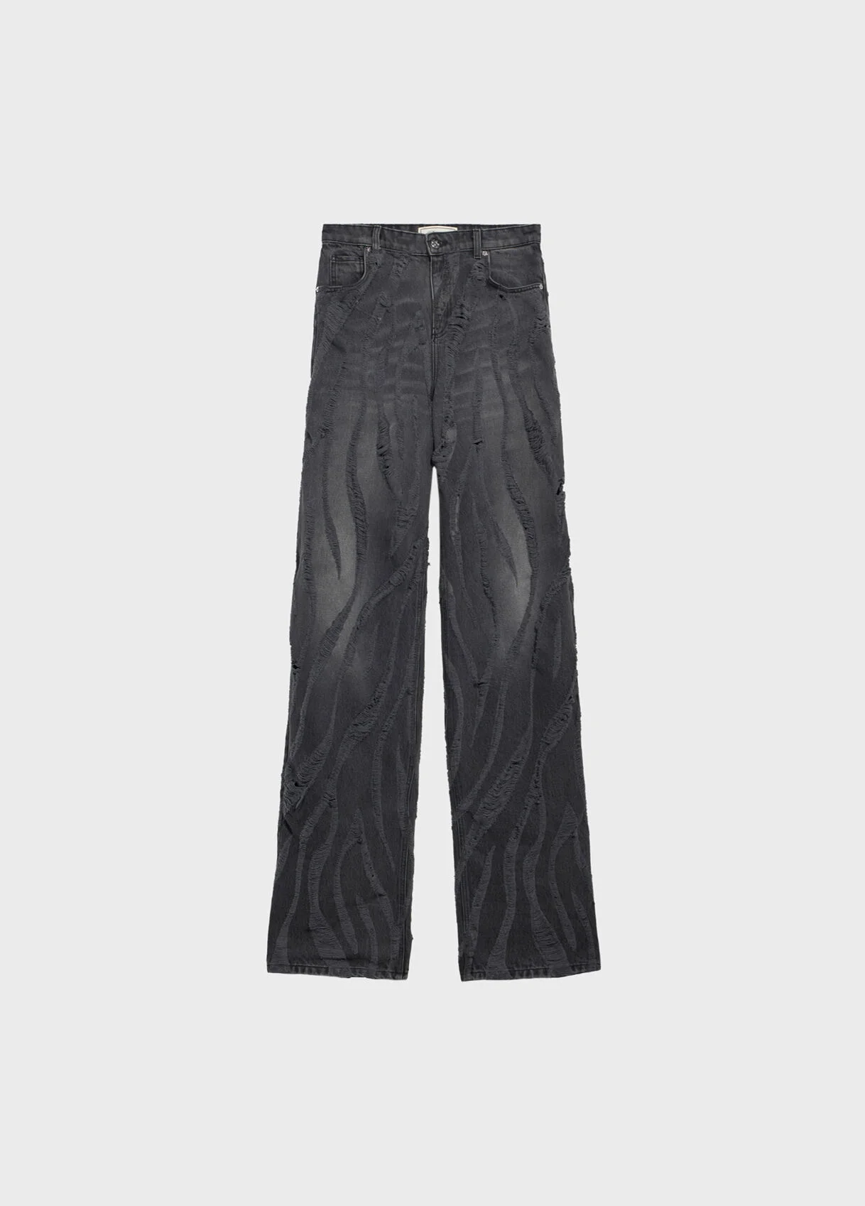 Baggy five-pocket jeans in stonewashed denim with a laser-etched zebra effect. - Stonewashed denim - Zebra-effect laser etching - Baggy style - Five pockets - Belt loops - Zip and button closure - B monogram label on the back - Puddle hem - Loose fit DETAILS Composition: External fabric: 100% Cotton; Secondary fabric: 65% Polyester, 35% Cotton Wash gently at max 30°C; Do not bleach; Do not tumble dry; Iron at low temperature - without steam; Do not dry clean; Wash separately; Do not expose to direct heat sources; Wash inside out