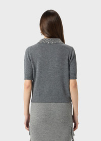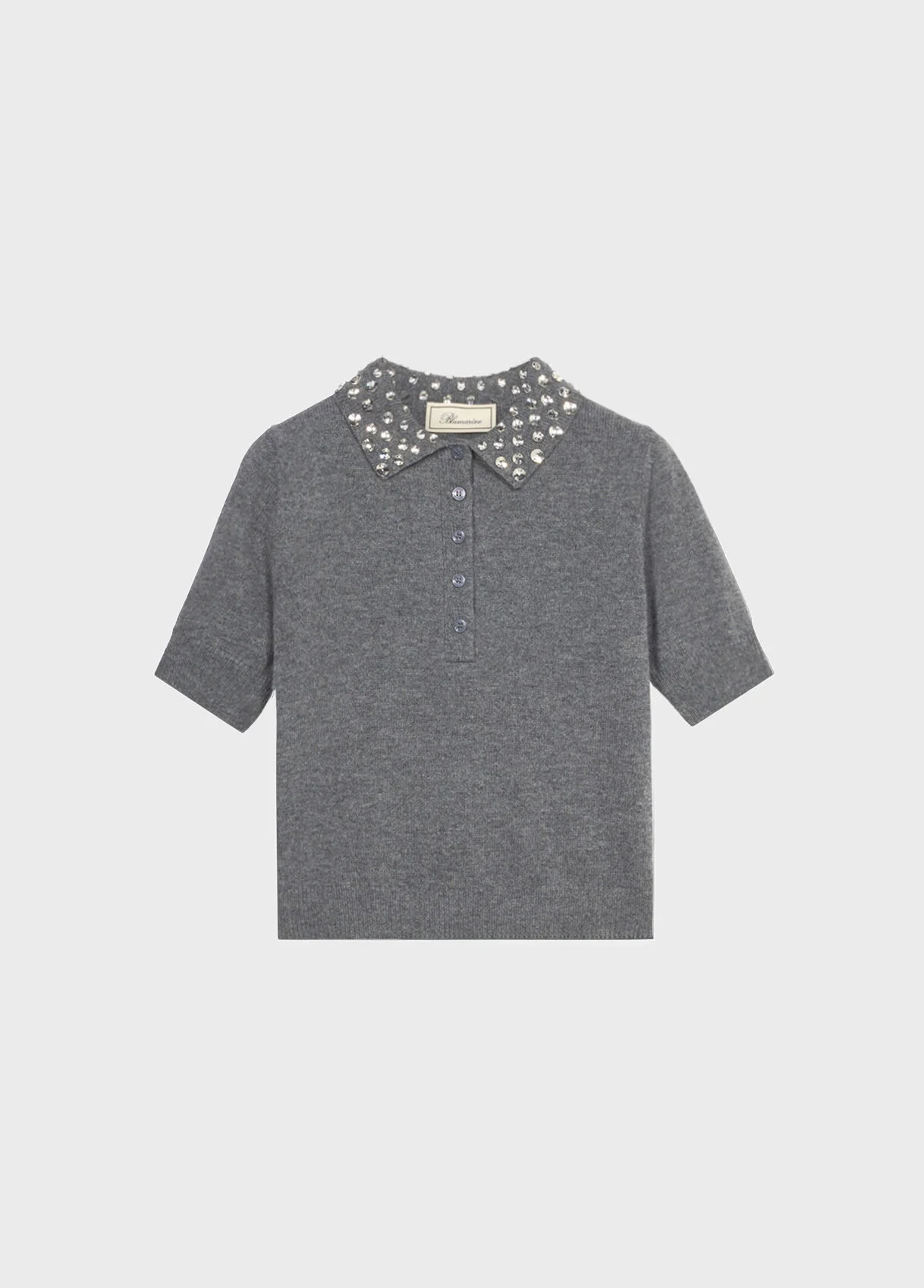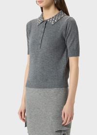 Short-sleeve polo shirt in smooth wool with hand-embroidered glass gemstones on the collar. - Stockinette stitch wool - Hand-embroidered glass gemstones on the collar - Polo shirt collar - Buttons - Short sleeves - Ribbed profiles - Regular fit DETAILS To find the correct size for you, please consult the Size Guide. Composition: Embroidery: 100% glass; Yarn 1: 100% wool Hand wash - room temperature; Do not bleach; Do not tumble dry; Iron at low temperature - no steam; Do not dry clean; Dry flat; Protect trims during wash; Wash inside out; Wash in mesh bag