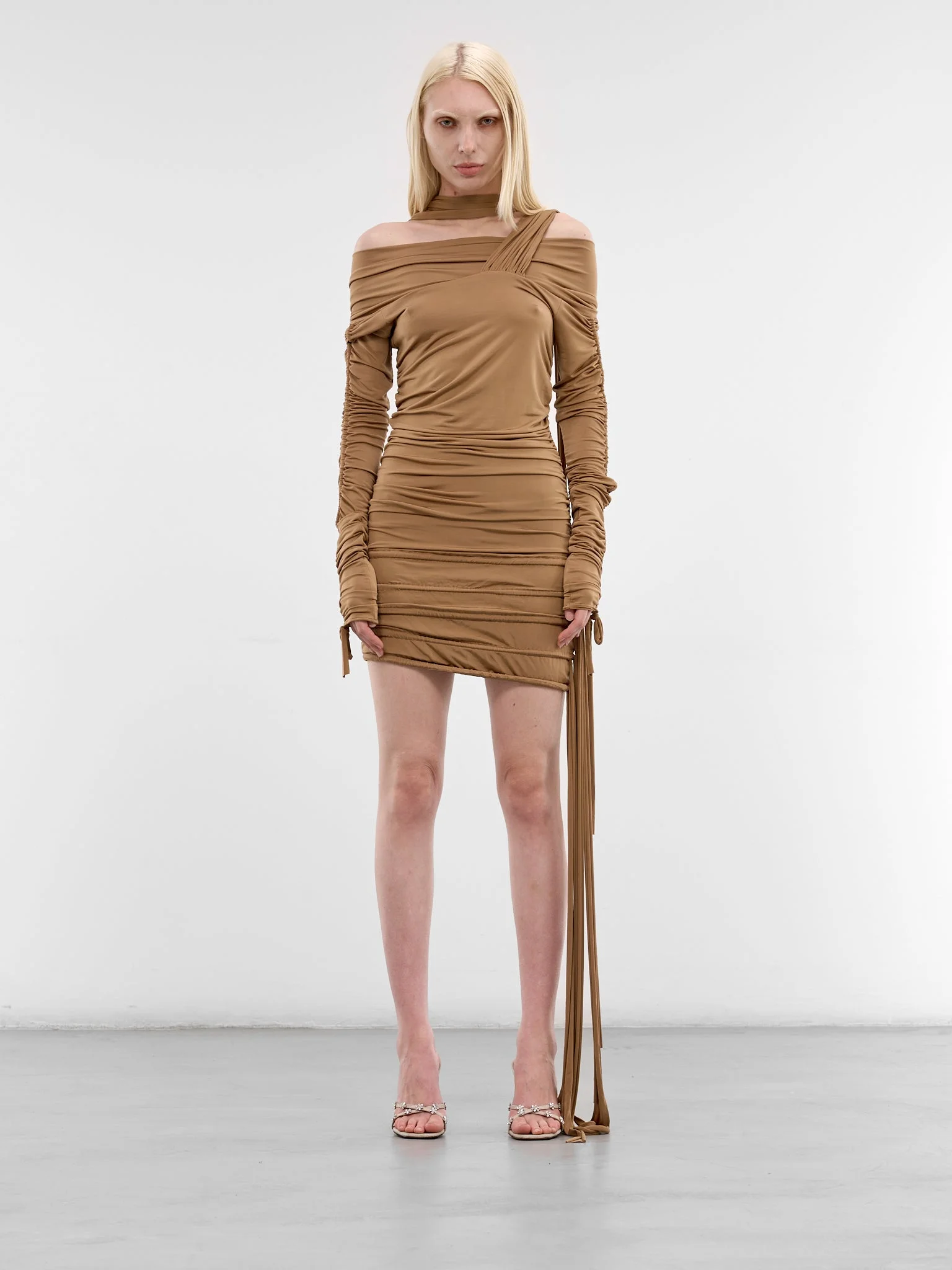 Dress in beige constructed in viscose with all-over ruching and asymmetric draping throughout. Featuring: • Slim fit • All-over ruching • Asymmetric draping • Asymmetric double strap and wrap-around neck • Extended draped straps • Off-shoulder neckline • Long sleeves • Self-ties at cuffs • Asymmetric hem • Mini length • Made in Italy • 93% Viscose 7% Elastane • Italian sizing Model is 5'9" wearing size 38. Bust: 32" Waist: 25" Hips: 34"