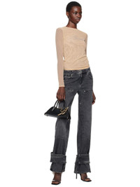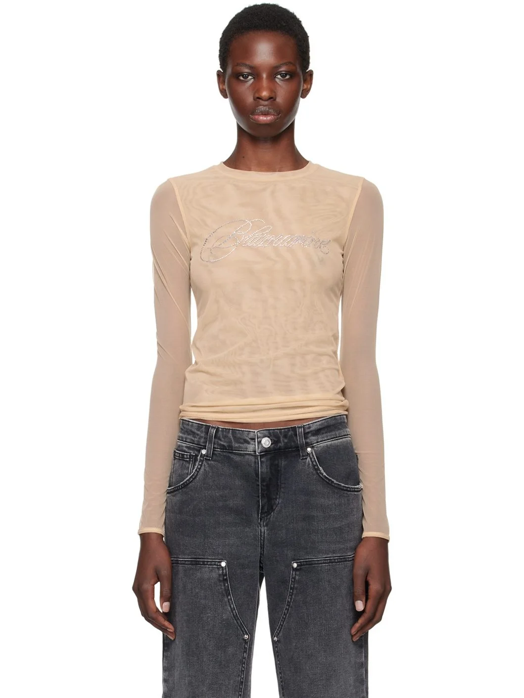 Semi-sheer double-faced stretch nylon mesh T-shirt. · Crewneck · Crystal-cut logo at chest Supplier color: Croissant Body: 82% polyamide, 18% elastane. Trim: 99% glass, 1% other fibers. Made in Italy 242901F110003
