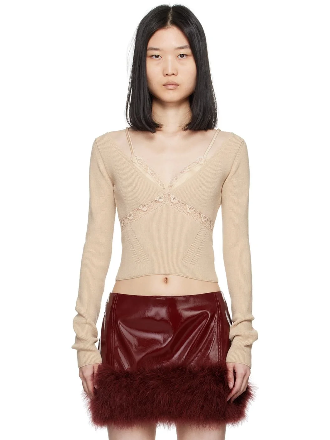 Knit nylon- and acrylic-blend sweater. Lace trim throughout. · V-neck · Pointelle detailing at front · Spaghetti straps · Stretch satin camisole-style underlay Supplier color: Croissant