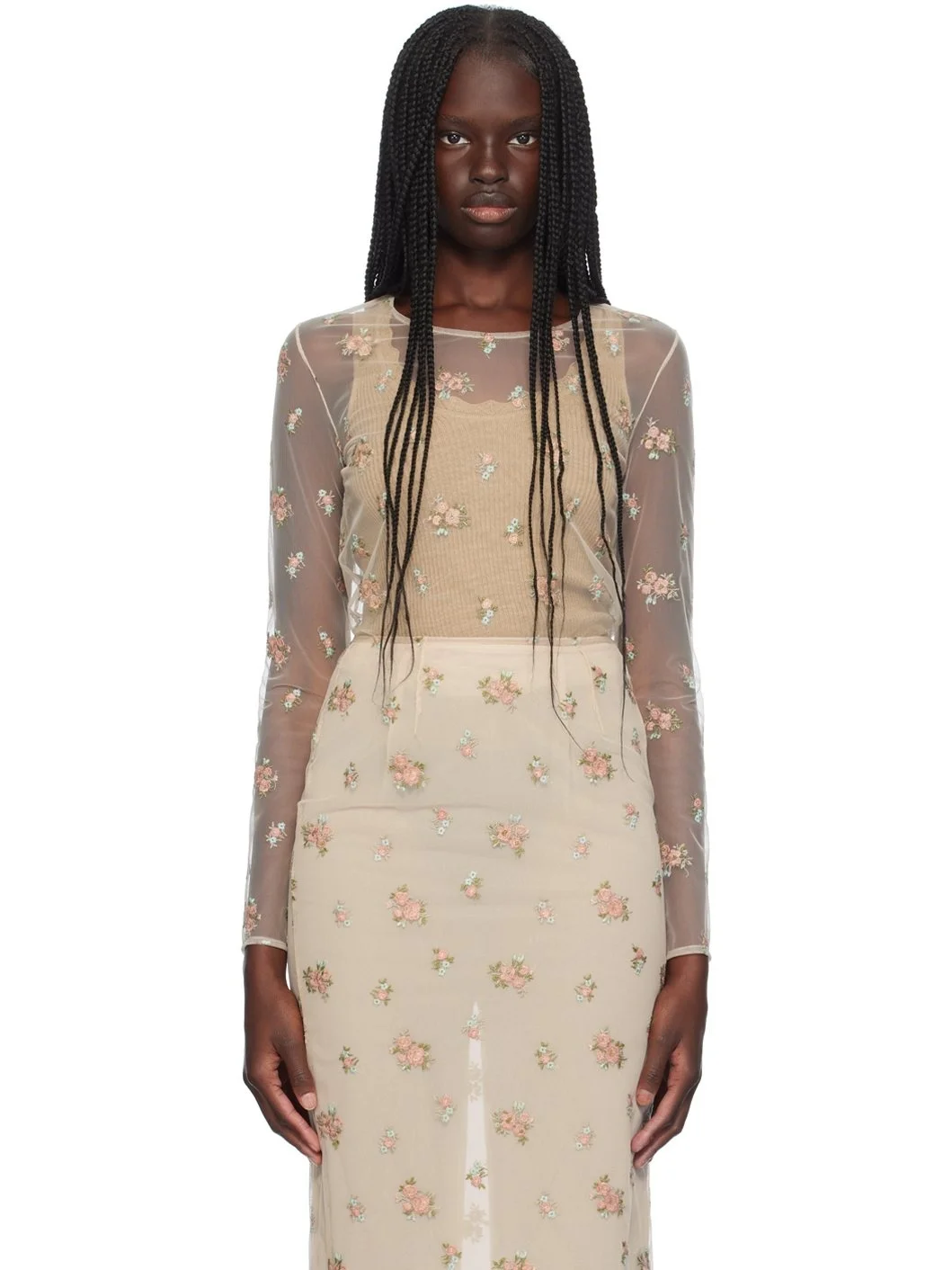 Sheer polyester- and nylon-blend tulle blouse. Floral pattern embroidered throughout. · Round neck · Button fastening and keyhole at back collar Supplier color: Grain/Ginger 68% polyester, 32% polyamide. Made in Italy 242901F107009