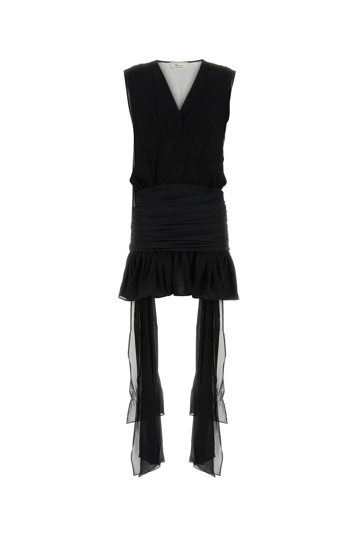 Mini dress realized in georgette with satin insert at the waist enriched by fabric bands on the sides. - V neckline - Gatherings on the sides - Lined DETAILS Black georgette mini dress Exterior: 100% Viscose Lining: 75% Nylon 25% Elastane Made in italy Sample size: 38