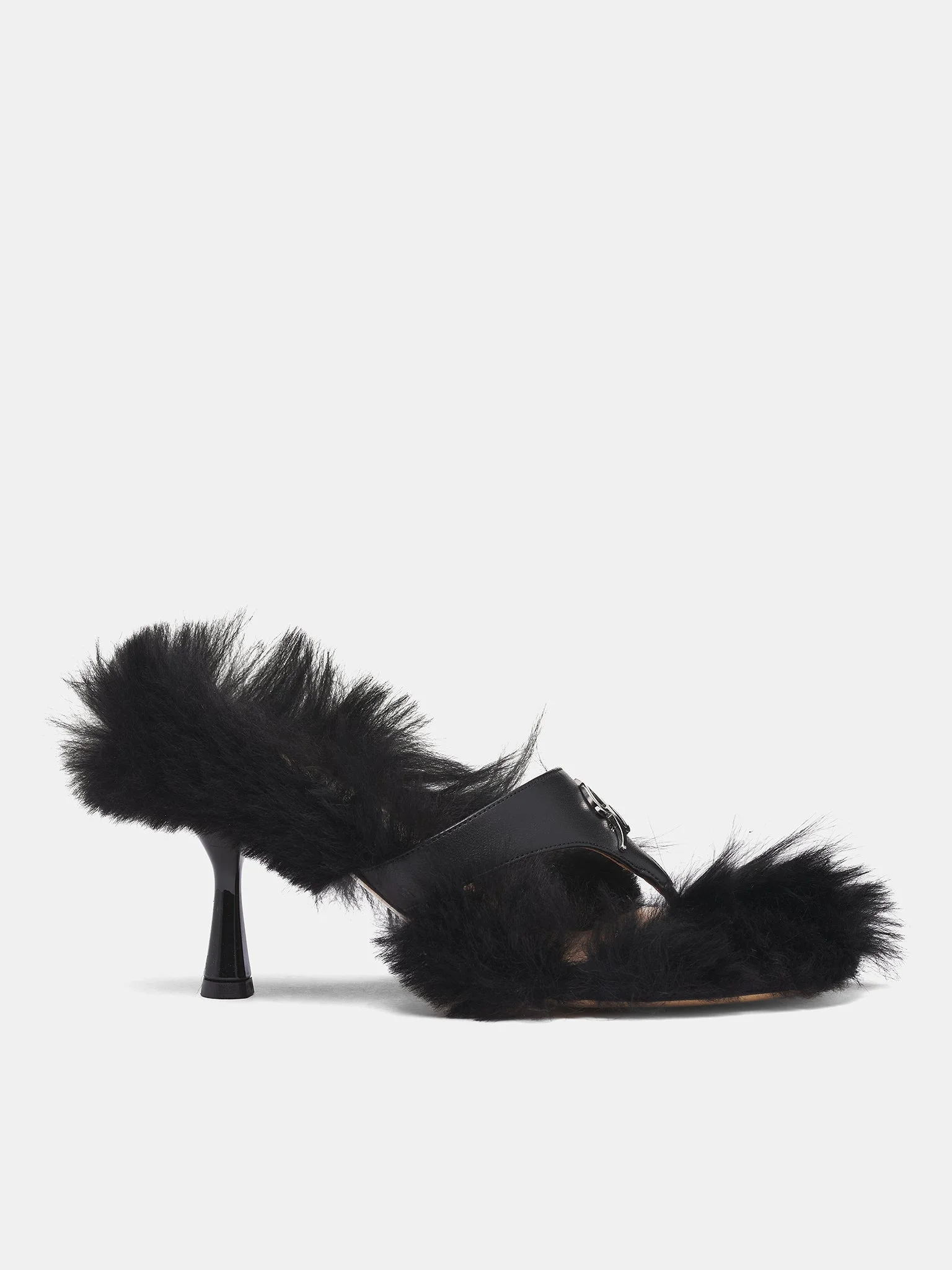 Black fur heeled sandals with sculpted, low-cut heel architecture are covered in cashmere lamb fur and finished with vamp logo hardware, leather sole, and a rounded toe. Featuring: • Low-cut, heeled silhouette • All-over cashmere lamb fur embellishment • Vamp logo hardware • Leather sole and rounded toe • Made in Italy • Main: 100% Cow Leather | Hardware: 100% Brass | Lining: 100% Cow Leather | Fur: 100% Lamb | Sole: 100% Calf Leather • Italian sizing