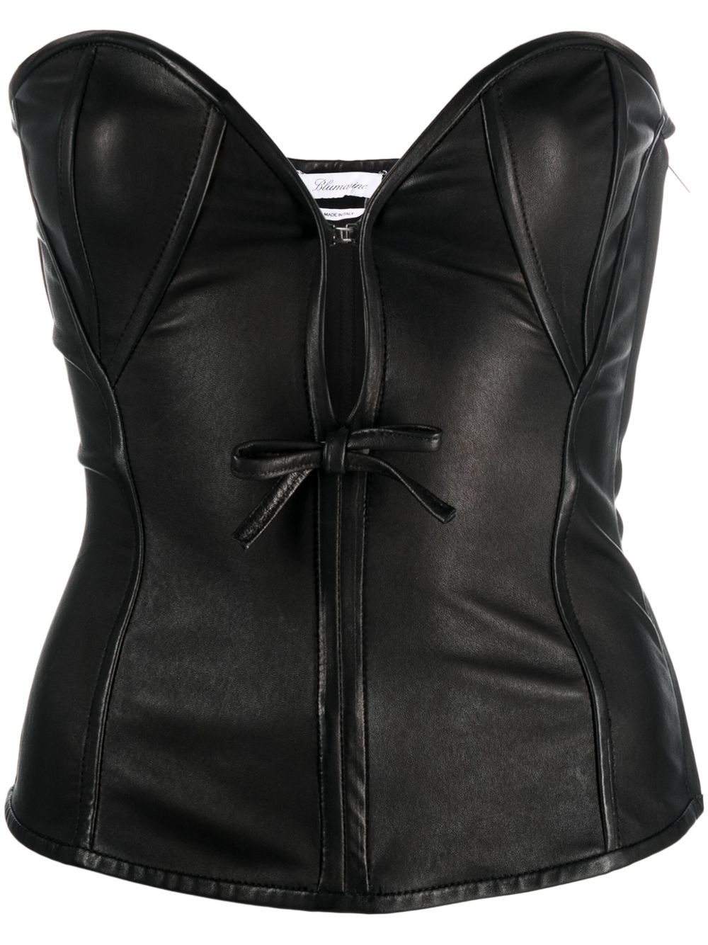 sweetheart-neck leather top Highlights - Black - Calf leather - Bow detailing - Cut-out detailing - Corset style - Sweetheart neck - Strapless - Straight hem Made in Italy Composition Calf Leather 100% SIZE & FIT Model measurements Height 5 ft 10 in(1.78 m) Bust/Chest 33.46 in(85 cm) Hips 36.22 in(92 cm) Waist 23.22 in(59 cm) FittingInformation Designed for a close fit throughout The moulded cups offer shape and support Soft leather has a supple and smooth construction offering some flexibility This piece fits true to size – take your usual size