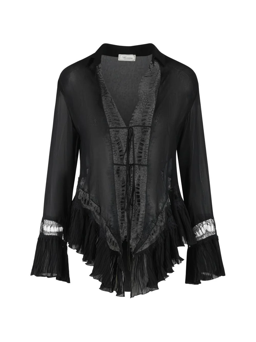 lace insert ruffled shirt Highlights - Black - Lace inserts - Pointed collar - Ruffled cuffs - Front lace closure - Pleated asymmetrical hem Made in Italy Composition Viscose 100% Washing instructions Read Manufacturer Guidelines