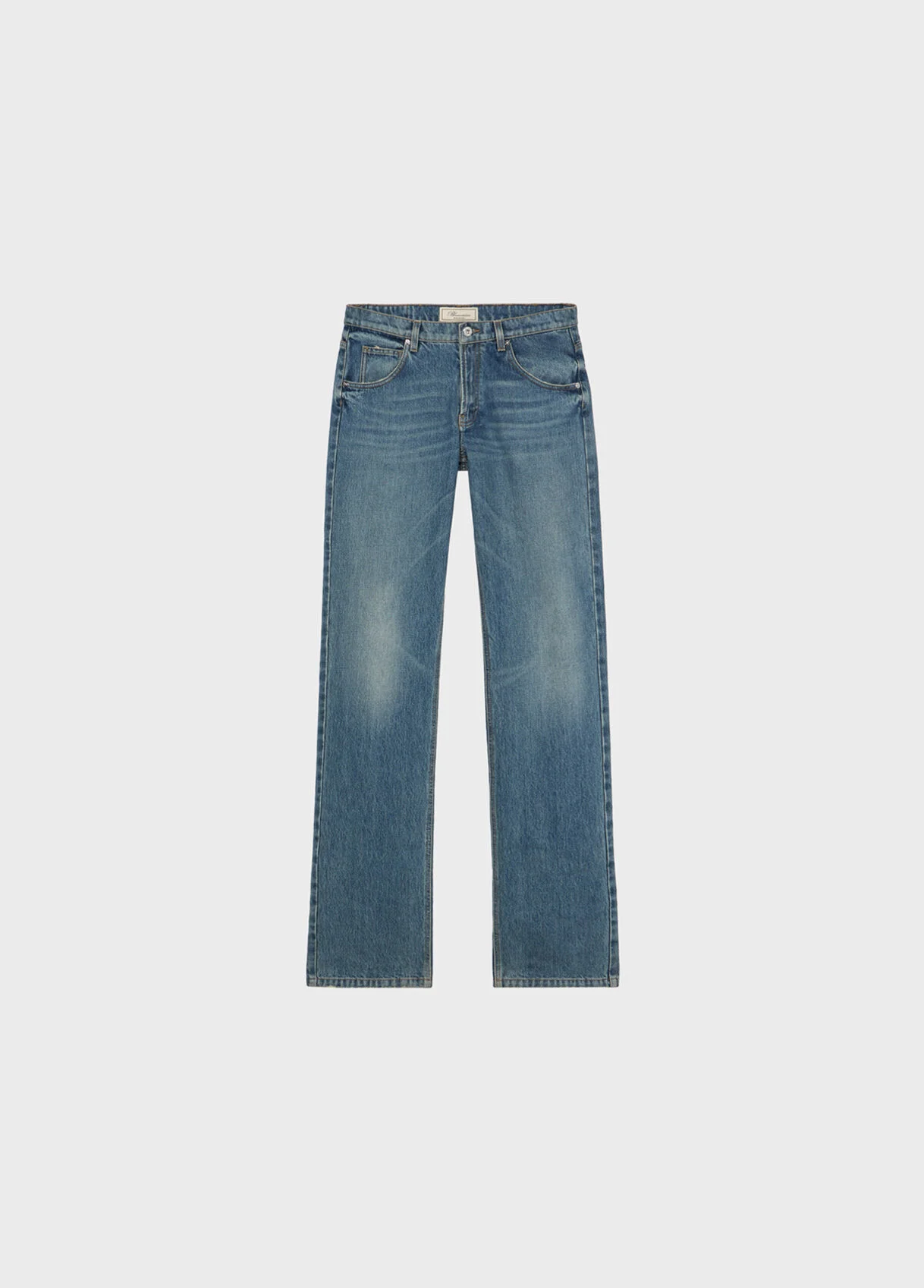 Five-pocket straight-leg jeans in stone-washed denim with blumarine logo printed in flock on the back. - Stone-washed denim - Blumarine logo printed in flock on the back - Straight leg style - Five-pocket style - Belt loops - Zipper and button closure - Puddle bottom - B monogram label at back - Regular fit DETAILS To find the correct size for you, please consult the Size Guide. Composition: Main fabric: 100% cotton; Fabric 2: 65% polyester, 35% cotton Wash delicate cycle max 30°C; Do not bleach; Do not tumble dry; Iron at low temperature - no steam; Do not dry clean; Hang dry in shade; Wash separately; Do not expose to direct heat; Wash inside out; Gentle spin; Iron inside out