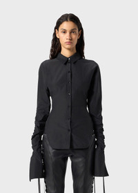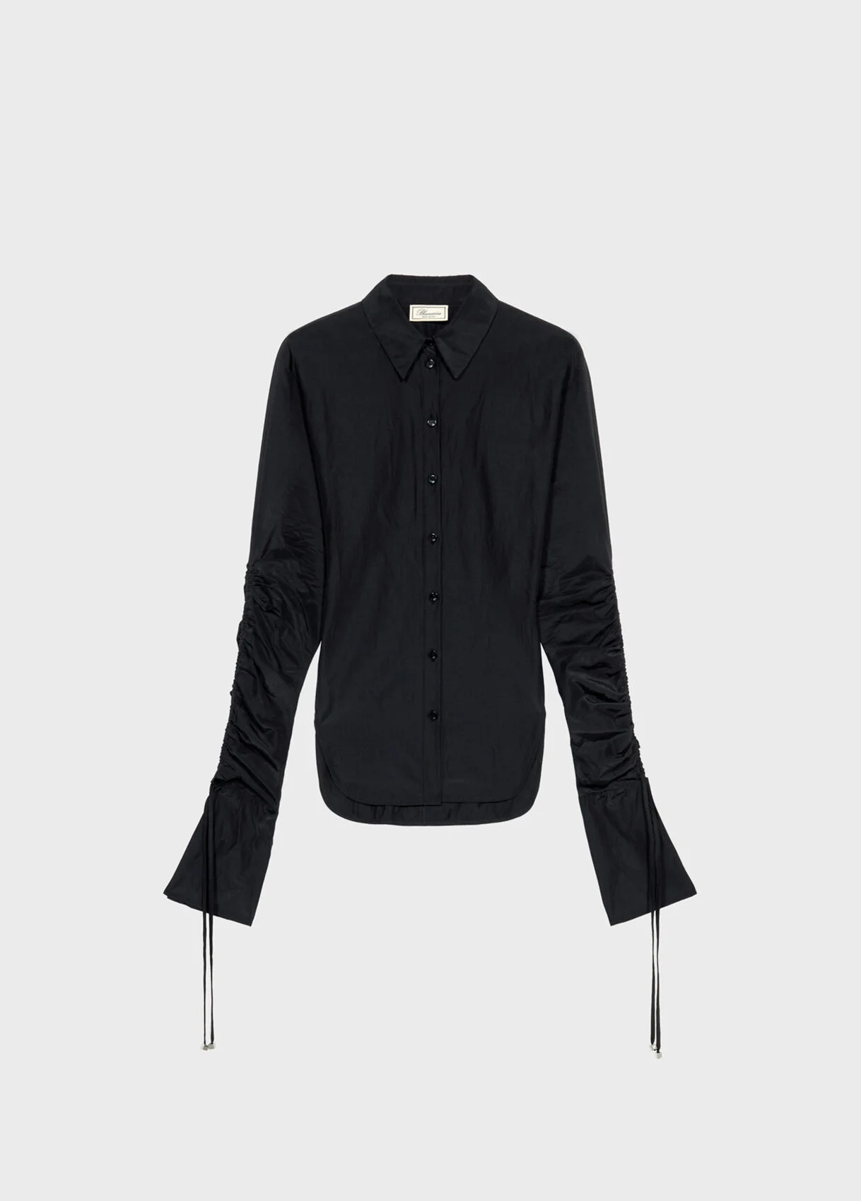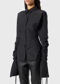 shiny technical fabric shirt with collar, buttons, high cuffs with ties. - Shiny technical fabric - Tailored fit - Collar - Long sleeves - High cuffs with ties - Button closure - Regular fit - Made in Italy DETAILS To find the correct size for you, please consult the Size Guide. Composition: Main fabric: 52% polyester, 48% cotton Wash delicate cycle max 30°C; Do not bleach; Do not tumble dry; Iron at low temperature - no steam; Dry clean with tetrachloroethylene or hydrocarbons - gentle cycle; Wash inside out; Gentle spin; Iron inside out