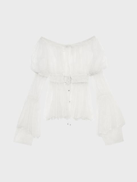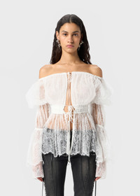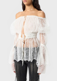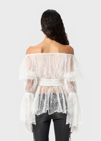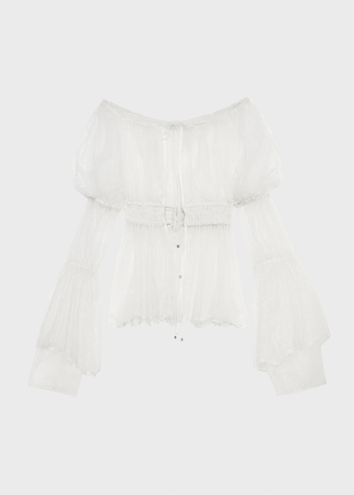CHANTILLY STRETCH LACE SHIRT WITH GATHERING DETAILS AT THE WAIST AND ON THE SLEEVES, TIE CLOSURE. COMPOSITION: 50% PA 50% VI - CHANTILLY STRETCH LACE - HONEYCOMB GATHERING DETAIL AT THE WAIST AND ON THE SLEEVES - WIDE NECKLINE THAT CAN ALSO BE OFF-SHOULDER - TIE CLOSURE - LONG PUFF SLEEVES - RUFFLE CUFFS - INNER LINING - REGULAR FIT DETAILS COLORS: WHITE