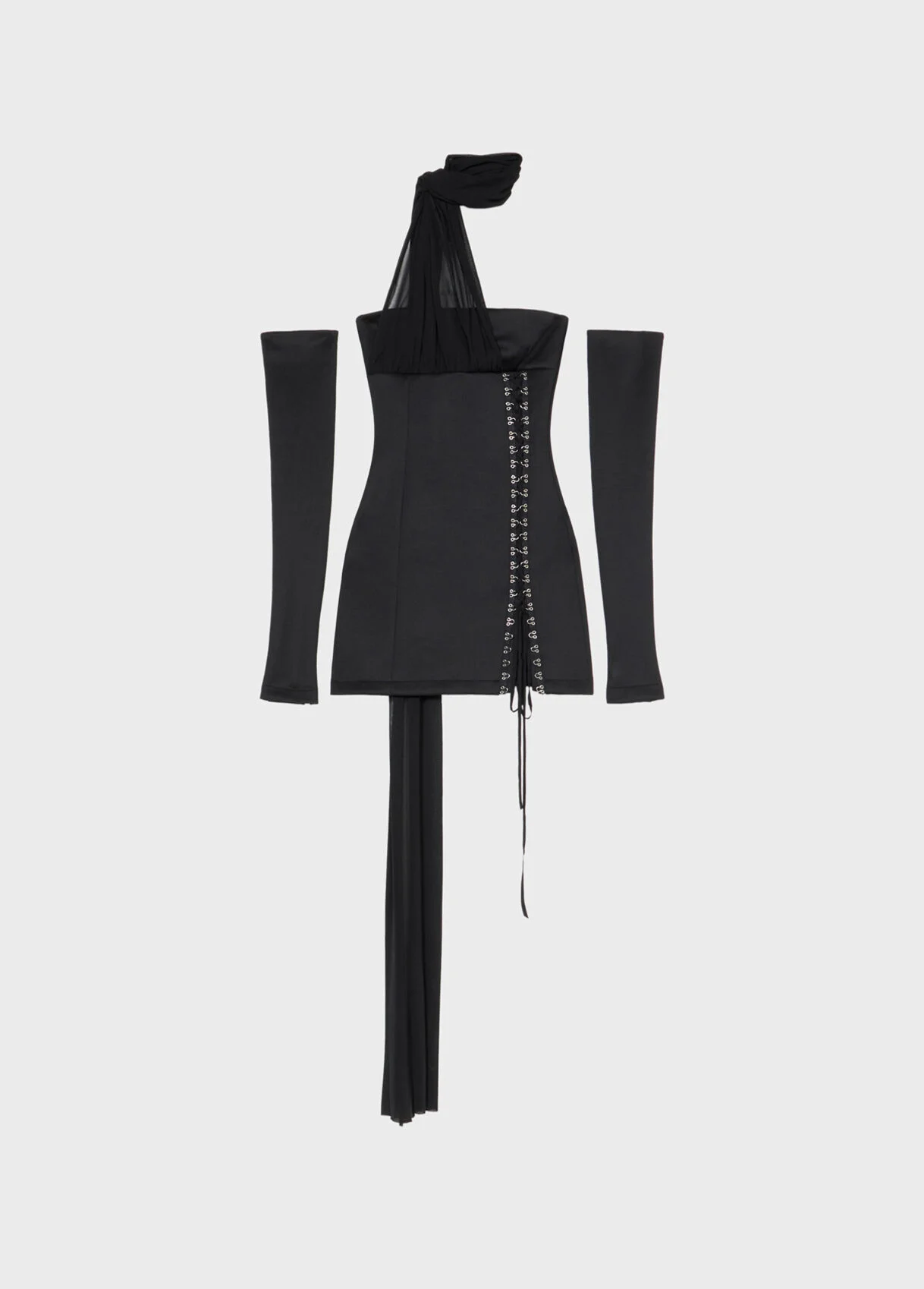 Mini dress in tech neoprene with viscose crepe jersey scarf, off-the-shoulder cut, glove sleeves, hook-and-lace side detail with small slit. - Tech neoprene - Viscose crepe jersey - Off-shoulder style - Straight neckline - Long sleeves - Scarf to tie around the neck - Side hook-and-lace detail - Small slit - Low-cut back - Zip closure at back - Mini length - Body-hugging fit - Made in Italy DETAILS To find the correct size for you, please consult the Size Guide. Composition: Main fabric: 85% polyester, 15% elastane; Fabric 2: 100% viscose Wash delicate cycle max 30°C; Do not bleach; Do not tumble dry; Iron at low temperature - no steam; Dry clean with tetrachloroethylene or hydrocarbons - gentle cycle; Wash inside out; Iron inside out