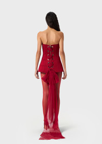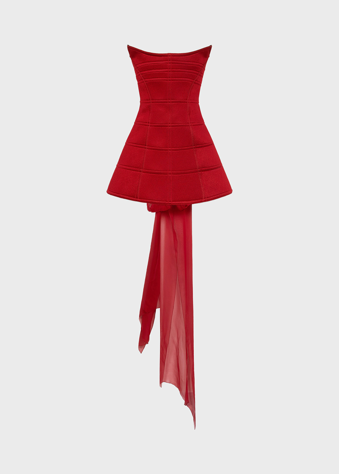 BUSTIER DRESS IN TECHNICAL NEOPRENE PAIRED WITH A BONED STRUCTURE, SCULPTED NECKLINE, BACK CLOSURE WITH METAL RINGS AND A CHIFFON TIE THAT HANGS IN A TRAIL. COMPOSITION: 84%VI 16%PL - TECHNICAL PAIRED NEOPRENE - GRID STAYS - BUSTIER CUT - SLEEVELESS - EXPOSED SHOULDERS - SCULPTED FRONT NECKLINE - BACK NECKLINE - BACK FASTENING WITH METAL RINGS AND A CHIFFON RIBBON THAT HANGS IN A TRAIL - MINI LENGTH - BODY-CON FIT DETAILS COLORS: RED