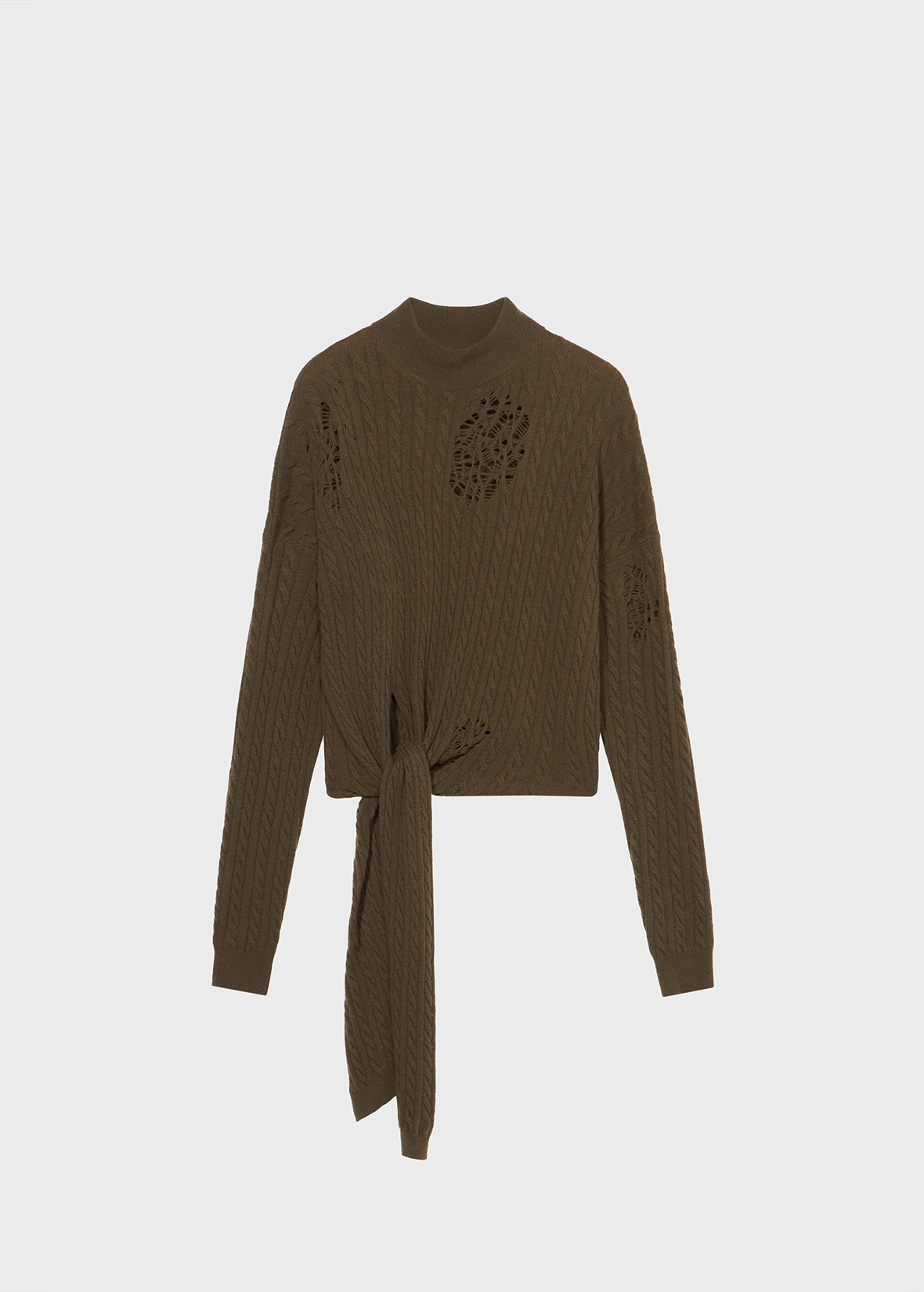 GRANDAD-NECK SWEATER IN TWISTED YARN WITH DISTRESSED DETAILS AND LONG TIES TO KNOT AT THE WAIST. COMPOSITION: 35%PA 30%WO 30%VI 5%WS - WOOL BLEND YARN - TWISTED YARN CONSTRUCTION - GRANDAD NECK - DISTRESSED DETAILS - LONG TIES TO KNOT AT THE WAIST - LONG SLEEVES - STOCKINETTE STITCH PROFILES - LOOSE FIT DETAILS COLORS: GREEN