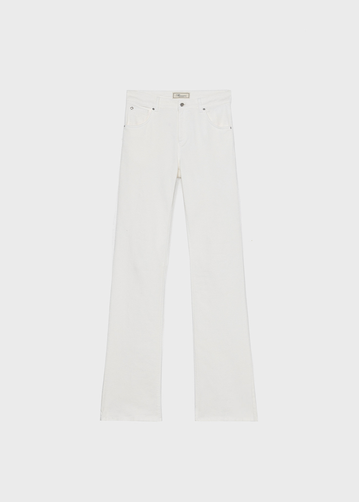 FIVE-POCKET BOOTCUT BULL COTTON JEANS WITH PUDDLE HEM AND B MONOGRAM EMBROIDERED LABEL ON THE BACK. COMPOSITION: 98% COTTON 2% ELASTANE - BULL COTTON - FIVE-POCKET STYLE - ZIPPER AND BUTTON CLOSURE - PUDDLE BOTTOM - B MONOGRAM LOGO LABEL AT BACK - BOOT CUT STYLE - REGULAR FIT DETAILS COLORS: WHITE