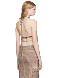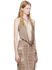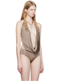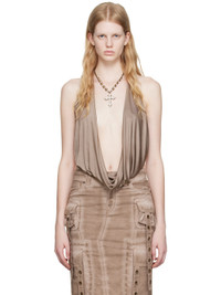 Viscose satin bodysuit. · Plunging cowl neck · Self-tie halter strap · Logo hardware at chest · Press-stud closure at bottom · Open back Supplier color: Coffee liqueur