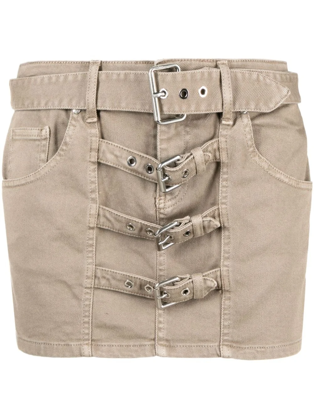 buckle-embellished denim miniskirt Highlights - Taupe brown - Stretch-cotton - Silver-tone hardware - Belt loops - Decorative buckle detailing - Front buckle fastening - Classic five pockets - Straight hem - Thigh-length Imported Composition Cotton 98%, Elastane 2% SIZE & FIT Model measurements Height 5 ft 10 in(1.78 m) Bust/Chest 30.7 in(78 cm) Hips 36.22 in(92 cm) Waist 25.59 in(65 cm) Washing instructions Machine Wash