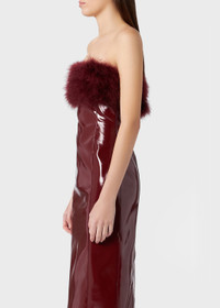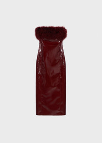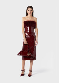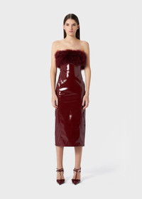 PENCIL SILHOUETTE FOR THIS SLEEVELESS PATENT MIDI DRESS WITH A YOKE IN DELICATE MARABOU FEATHERS, EXPOSED STITCHING, AND A SIDE SLIT. COMPOSITION: 68% PL 32% PU - PATENT FINISH - PENCIL STYLE - MARABOU FEATHER YOKE - SLEEVELESS CUT - EXPOSED SEAMS - SIDE VENT - MIDI-LENGTH - REGULAR FIT DETAILS COLORS: BORDEAUX