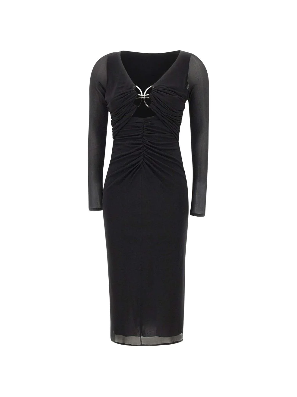 butterfly-clasp ruched midi dress Highlights - Black - Sheer long sleeves - Metal butterfly clasp - Front ruching - Concealed back zip - Cut out below the bust Made in Italy Composition Lining: Polyamide 75%, Spandex/Elastane 25% Outer: Viscose 100% Washing instructions Read Manufacturer Guidelines