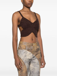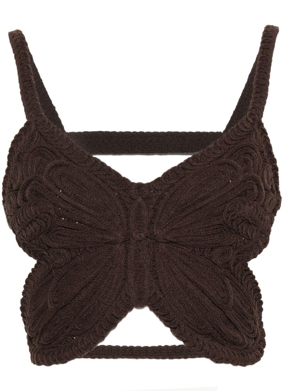 butterfly sleeveless crop top Highlights - Chocolate brown - Cotton blend - Butterfly style - Sleeveless - V-neck - Cut-out detailing - Asymmetric hem - Cropped Composition Cotton 75%, Polyamide 25% SIZE & FIT Model measurements Height 5 ft 11 in(1.8 m) Bust/Chest 32.3 in(82 cm) Hips 35.4 in(90 cm) Waist 22.8 in(58 cm) FittingInformation Designed for a close fit throughout Cropped in length Made from a midweight fabric This piece fits true to size – take your usual size