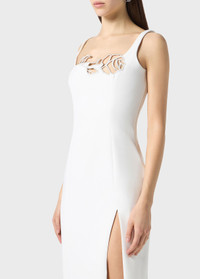 A laser-cut embroidered rose decorates the decollete of the midi dress in cady crepe with a square neckline and slit on one leg. - Cady crepe - Laser-cut embroidered rose at the neckline - Square neckline front and back - Sleeveless cut - Shoulder pads - Vent at the leg - Fully lined - Midi-length - Body-hugging fit - Made in Italy DETAILS To find the correct size for you, please consult the Size Guide. Composition: Main fabric: 96% polyester, 4% elastane; Main lining: 100% polyester Hand wash - room temperature; Do not bleach; Do not tumble dry; Iron at low temperature - no steam; Dry clean with tetrachloroethylene or hydrocarbons - gentle cycle; Do not expose to direct heat; Wash inside out; Iron inside out