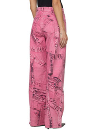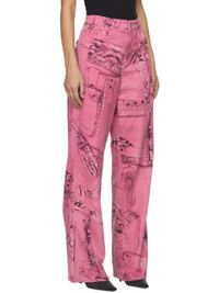 Stretch denim jeans. Trompe l'œil graphic printed throughout. · Belt loops · Five-pocket styling · Zip-fly · Logo embroidered at back waistband Supplier color: Geranio/Nero 98% cotton, 2% elastane. Made in Albania 241901F069001