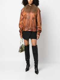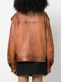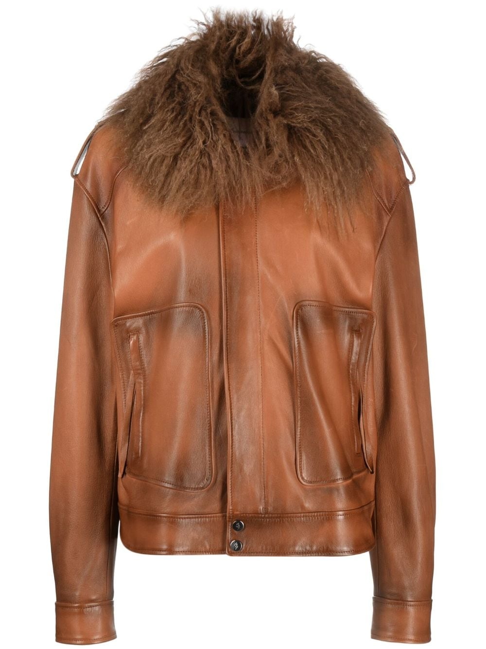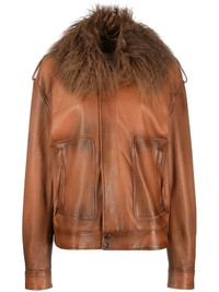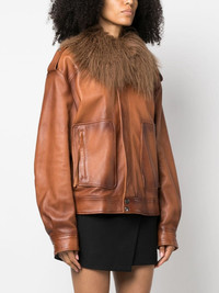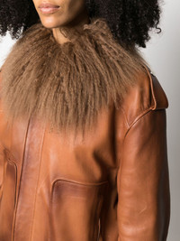 concealed-fastening leather jacket Highlights - Chocolate brown - Calf leather - Shearling collar - Concealed front fastening - Long sleeves - Two side zip-fastening pockets - Straight hem Composition Outer: Calf Leather 100% Lining: Viscose 57%, Polyester 43% SIZE & FIT Model measurements Height 5 ft 10 in(1.78 m) Bust/Chest 32.3 in(82 cm) Hips 35.4 in(90 cm) Waist 24.8 in(63 cm) FittingInformation Designed to be unstructured, offering a loose fit throughout Soft leather has a supple and smooth construction offering some flexibility This piece fits true to size – take your usual size