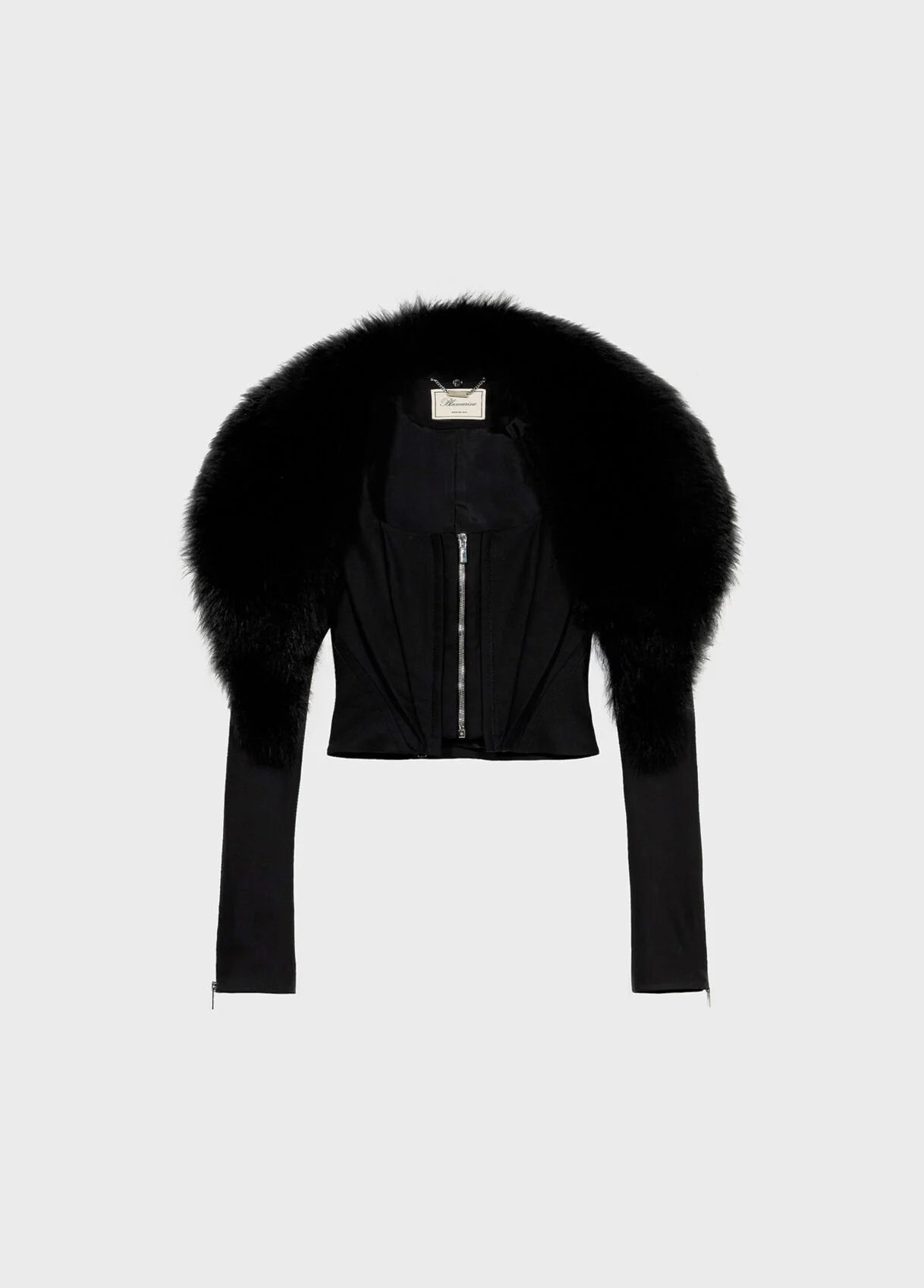 cropped wool twill jacket with fur collar, pleated front, zip closure, long sleeves with zip at cuffs. - Wool twill - Cropped line - Fur collar - Pleated and zip front - Zip at cuffs - Regular fit - Made in Italy DETAILS To find the correct size for you, please consult the Size Guide. Composition: Main fabric: 54% polyester, 44% virgin wool, 2% elastane; Main lining: 57% viscose, 43% polyester; Padding (fibres): 100% polyester; Lining 2; 100% polyester;Fur insert: lamb Do not wash; Do not bleach; Do not tumble dry; Iron at low temperature - no steam; Dry clean with tetrachloroethylene or hydrocarbons - gentle cycle; Remove detachable accessories before cleaning; Clean inside out; Iron inside out