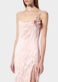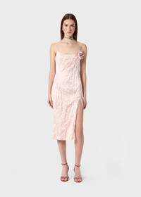 CRINKLED SATIN SLIP DRESS WITH A SIDE SLIT AND 3D ROSE-ACCENTED NECKLINE. COMPOSITION: 53%VI 36%CO 11%ME - FOISSE-EFFECT COTTON VISCOSE SATIN - SLIP-STYLE LINE - SHOULDER PADS - STRAIGHT NECKLINE WITH 3D ROSES - SLEEVELESS CUT - SIDE SLIT - FULLY LINED - MIDI-LENGTH - REGULAR FIT DETAILS COLORS: PINK