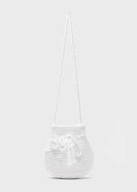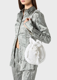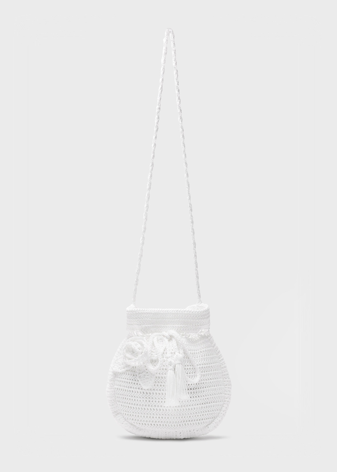CROCHET COTTON DRAWSTRING BAG WITH SHOULDER STRAP, HANDMADE ROSE DECORATIONS, CLOSED WITH DRAWSTRINGS AND TIES. COMPOSITION: 100%CO - COTTON - CROCHET STITCH - SACK-STYLE SILHOUETTE - SMALL SIZE - SHOULDER STRAP - HAND-MADE ROSE DECORATIONS - DRAWSTRING CLOSURE DETAILS COLORS: WHITE