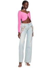 Knit cotton- and nylon-blend cardigan. · Rib knit plunging sweetheart neck · Concealed button closure · Graphic embroidered at front · Asymmetric cropped hem · Raglan sleeves Supplier color: Geranio