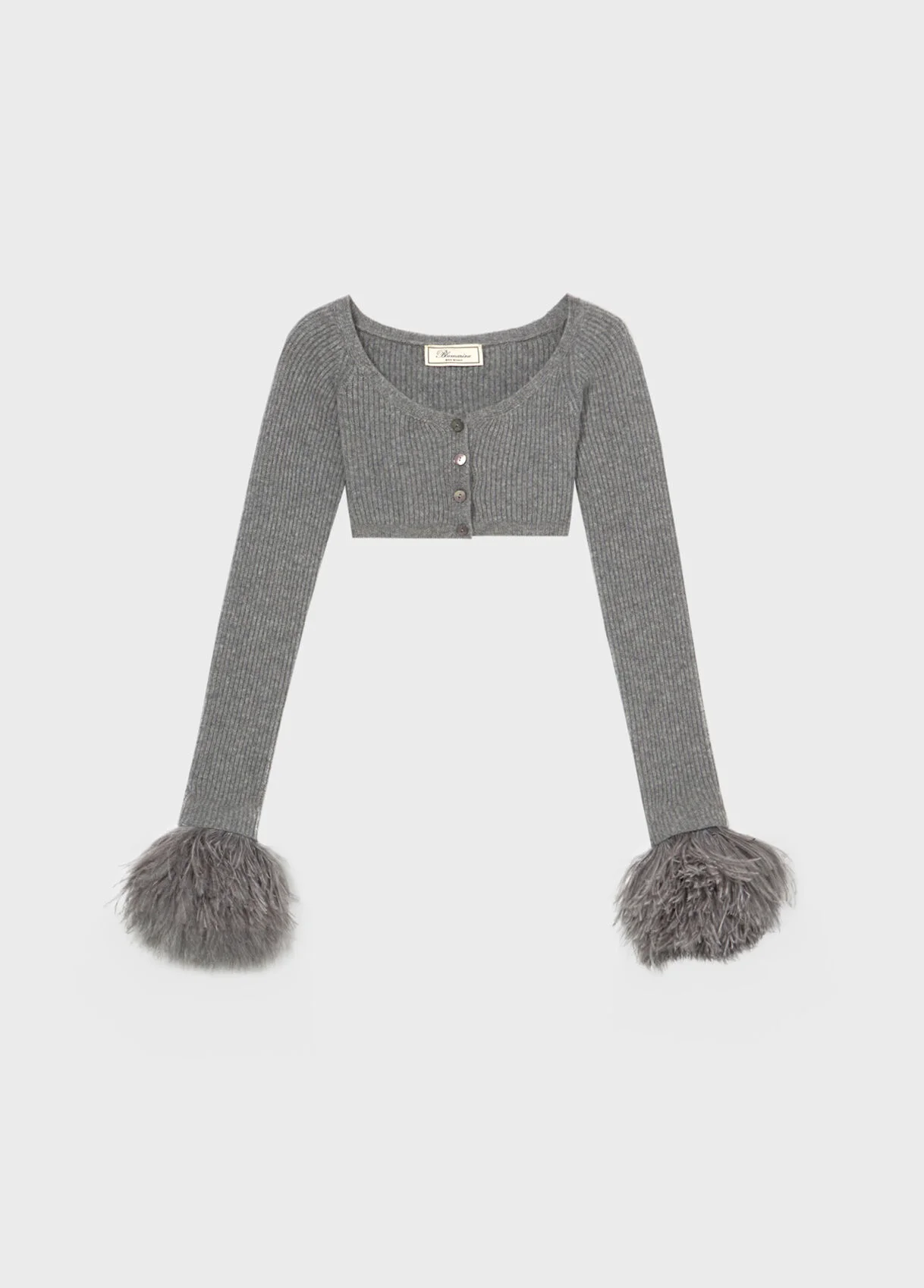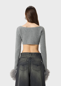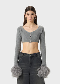 Cropped cardigan in ribbed wool with wide neckline and feather-trimmed cuffs. - Fisherman's rib stitch wool - Cropped design - Round neckline - Long sleeves - Feather-trimmed cuffs - Button closure - Body-hugging fit - Made in Italy DETAILS To find the correct size for you, please consult the Size Guide. Composition: Main lining: 100% polyester; Padding (Fibres): 100% polyester; Yarn 1: 100% wool Do not wash; Do not bleach; Do not tumble dry; Iron at low temperature - no steam; Dry clean with tetrachloroethylene or hydrocarbons - gentle cycle; Protect buttons when dry cleaning; Remove detachable accessories before cleaning; Wash inside out