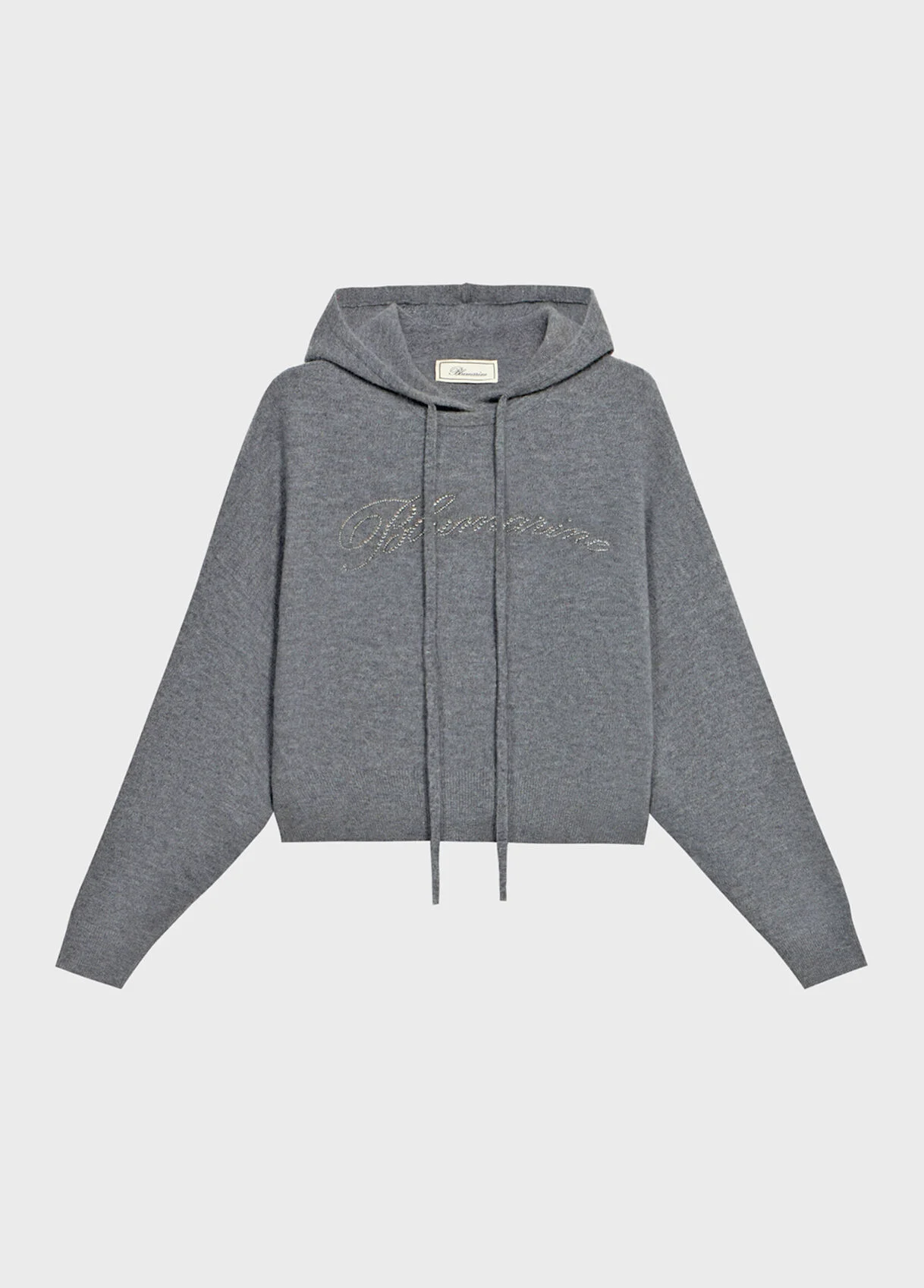 Wool sweater with hood and blumarine logo embroidered in glass rhinestones. - Wool - Blumarine logo embroidered in glass rhinestones - Hood - Drawstring - Long sleeves - Side slits - Ribbed cuffs and bottom - Loose fit DETAILS To find the correct size for you, please consult the Size Guide. Composition: Embroidery: 100% glass; Yarn 1: 100% wool Hand wash - room temperature; Do not bleach; Do not tumble dry; Iron at low temperature - no steam; Do not dry clean; Dry flat in shade; Wash inside out; Iron inside out; Do not wash trims
